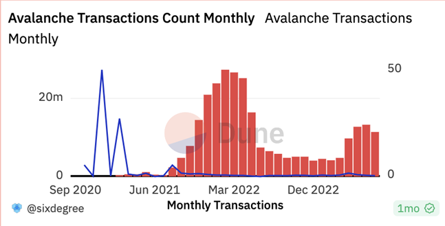 Taking a look at this excellent Dune board from sixdegree, we see that Avalanche’s monthly transaction count has recovered significantly from the lows of early 2022, boosted with some help from the variety of institutional partnerships Avalabs has landed which has sparked significant interest in Avalanche subnets. For the most part, this monthly transaction count has stabilized and hasn’t gone down after its levels spiked. As more users look to Avalanche to explore opportunities across DeFi, NFTs, and the numerous advantages of building on Avalanche, this activity should only increase further.