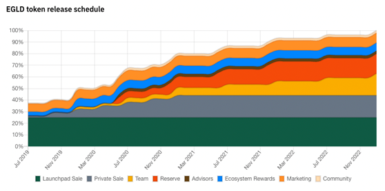 An intriguing feature of eGLD is its supply cap, fixed at 31,415,926. Initially, early token holders were subjected to lockups, but, as of 2023, the entire supply is now circulating(image below). Such a cap is intentional, driving the token's scarcity and, by extension, its potential demand. Furthermore, instead of adopting a model that continually issues new tokens, MultiversX’s framework utilizes transaction fees. This mechanism effectively diminishes the theoretical ceiling of eGLD, further amplifying its scarcity over time.