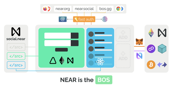 In March 2023, the NEAR protocol introduced the Blockchain Operating System (BOS), an open-source platform empowering developers with the flexibility to build across diverse blockchain environments using familiar programming languages and equipping crypto users with a familiar Web 2 UX. The BOS is designed to be inclusive and democratize the open, catering not only to seasoned web3 enthusiasts but also to the broader audience who might be newer to the decentralized web. A significant breakthrough in the system is eliminating the immediate need for a new user to own any cryptocurrency, substantially reducing the friction of user onboarding.