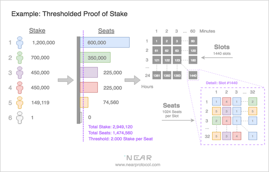 TPoS endeavors to cultivate an extensive participant pool, comprised of witnesses (an individual participant) that are designated for election during consensus deliberations. These elections follow a prescribed structure over a 24-hour period, segmented into 1,440 slots, implying a slot a minute. An impressive tally of 1,024 witnesses is allocated per block, cumulatively providing 1,474,560 individual witness opportunities (seats). The price of each seat is inherently anchored to the aggregate NEAR staked by the aspiring witnesses. A compulsory lock-in period of three days is imposed on any NEAR earmarked for this purpose.
