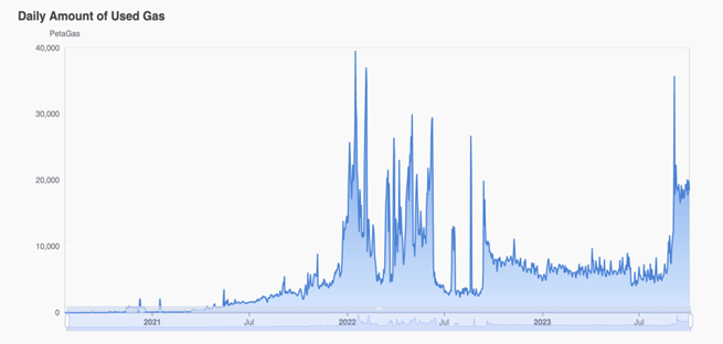 The protocol's native token, NEAR, powers the smart contracts that get executed on the network. NEAR tokens are somewhat analogous to ETH in the Ethereum network in this way. However, a distinct fee-burning mechanism is employed where 70% of transaction fees are burned, and the remaining 30% are directed to the originating contract (developer rewards).This is a critical distinction when compared to other smart contract blockchains, as they do not have direct developer incentives “baked into” the protocol. As the image below illustrates, the amount of gas used by the network has seen a dramatic increase in Q2 2023, translating to more NEAR burned and more developer rewards all around.